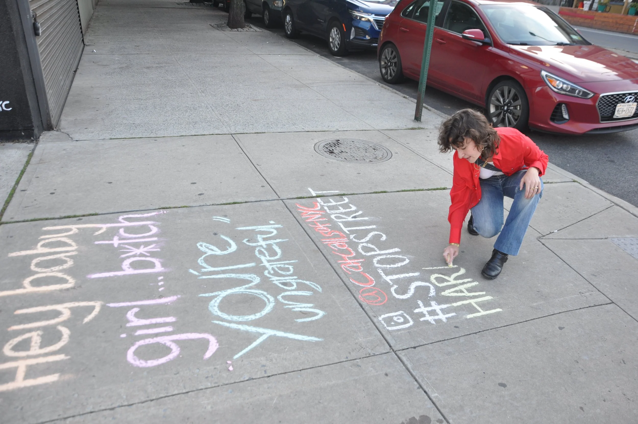 Sandberg chalking for anti-street harassment for women in Queens, NY.